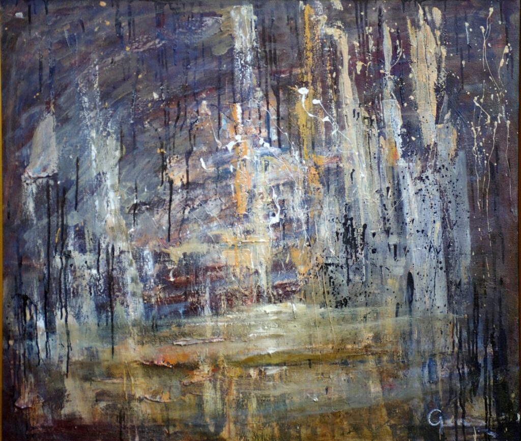 The Rainfall (oil on canvas, 80X60 cm, 2014) is also distinguished by its contradictory and multi-layered expressiveness. The work is based on the motif of abstract expressionism and creates a picture of spontaneously erupting energy. At the same time, it looks like a landscape of heavy rain seen from a window glass, and the center highlighted by a strong flow of water is perceived as a silhouette of the crucifixion. Accordingly, apocalyptic images also have a strong dramatic charge and fatal sadness.